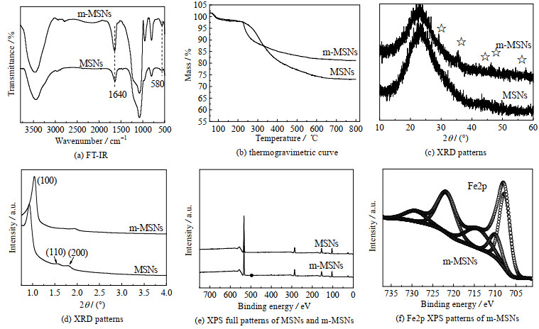 从MSNs和m-MSNs的热失重曲线(图 1(b))可见,随着温度的升高,失重增加,最后达到稳定。250 ℃以下的失重主要是材料表面结合水的蒸发,250~800 ℃的失重主要是未除干净的表面活性剂的分解。制备的MSNs只是在80 ℃下老化,未进行高温处理,而m-MSNs在进行铁掺杂时经400 ℃加热处理,因而铁掺杂以后的介孔复合材料具有更高的热稳定性,这和失重曲线结果一致。