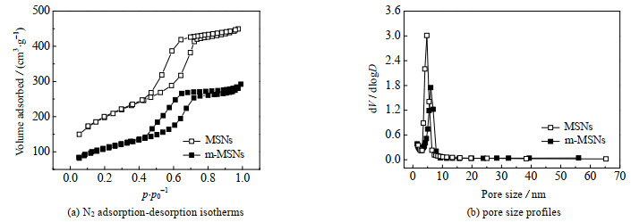 图 2 MSNs和m-MSNs的氮气吸附-脱附等温线和孔径分布图 Fig.2 N2 adsorption-desorption isotherms and pore size profiles of MSNs and m-MSNs |
