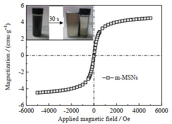 从磁滞回线图(图 3)中可以发现m-MSNs的磁滞回线关于原点对称,说明m-MSNs具有超强的顺磁性。在298 K下m-MSNs的磁饱和强度为4.48 emu·g-1,在外部磁场的作用下可快速分离介孔复合材料m-MSNs。内嵌图为悬浮在乙醇中的m-MSNs以及在外加磁场作用后的对比图片。由内嵌图可知,m-MSNs在30 s内就被成功分离。