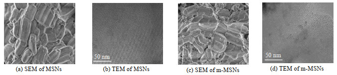 图 1 介孔材料MSNs和m-MSNs的表征图 Fig.1 Characterization results of mesoporous materials MSNs and m-MSNs |