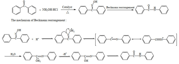 以二苯甲酮为底物一步无溶剂法合成N-苯基苯甲酰胺的催化反应式和反应机理如图 5所示,二苯甲酮与盐酸羟胺反应生成N-苯基苯甲酮肟,经Beckmann重排进一步转化生成目标产物N-苯基苯甲酰胺。