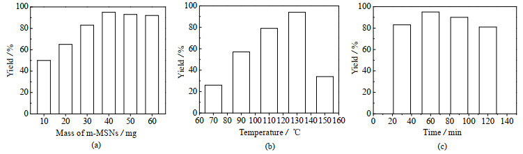 控制催化剂用量为40 mg,反应时间为60 min,探究反应温度为70、90、110、130、150 ℃对反应产率的影响,结果如图 6(b)所示。从图中结果可知在70~130 ℃,m-MSNs的催化效果和反应温度呈正相关,随着反应温度的升高,催化效果逐渐显现。在130~150 ℃,m-MSNs的催化效果和反应温度呈负相关,随着反应温度的升高,催化效果不断降低。当反应温度为70 ℃时,N-苯基苯甲酰胺的产率只有26%;反应温度为90 ℃时,产率为57%;反应温度为110 ℃时,产率为79%;在反应温度为130 ℃时催化效果最好,产率达到94%;当反应温度为150 ℃时,产率为34%。秉承低温有利于降低能耗的原则,选择130 ℃为最优反应温度。