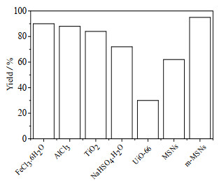 3.2.5 与其他催化剂的催化性能对比选取了FeCl3·6H2O、AlCl3、NaHSO4·H2O、TiO2、UiO-66、MSNs和m-MSNs几种催化剂进行催化性能的对比,按照实验方法控制原料二苯甲酮2 mmol、盐酸羟胺3 mmol,采用无溶剂一步法合成相应的酰胺产物,反应温度为130 ℃,反应时间60 min,各种催化剂的用量为0.2 mmol,N-苯基苯甲酰胺的产率如图 7所示。从图中结果可知,m-MSNs的催化性能明显优于MSNs,说明介孔孔道内引入Fe3O4大大提高了催化剂的催化效率。另外,m-MSNs的催化效果也要明显优于FeCl3·6H2O、AlCl3、NaHSO4·H2O等催化剂,进一步证实了铁掺杂介孔氧化硅催化剂的高效性。
