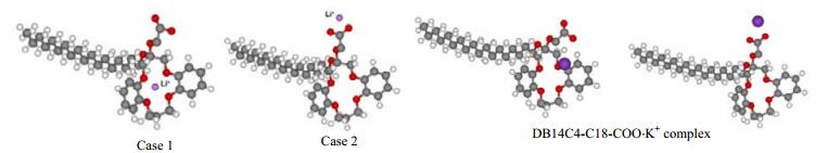 图 9 DFT计算DB14C4-C18-COO−Li+的优化结构的两种构象 Fig.9 Two configurations of the optimized structure of DB14C4-C18-COO−Li+ complex obtained by DFT calculation Binding energy: −242 kJ·mol -1(case 1-left) and −282 kJ·mol -1 (case2-right). DB14C4-C18-COO−K+, −156 kJ·mol -1 (left) and −224 kJ·mol -1 (right)[52] |