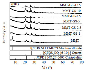 3 结果与讨论 3.1 蒙脱石-葡萄糖(MMT-GS)的结构表征图 1为蒙脱石和蒙脱石-葡萄糖的XRD谱图。蒙脱石-葡萄糖(MMT-GS)的衍射峰与蒙脱石基本一致,且并未出现新的衍射峰,说明蒙脱石在吸附葡萄糖之后结构没有发生变化。蒙脱石-葡萄糖(001)晶面的衍射峰强度明显降低,并且随着葡萄糖含量的增加,蒙脱石-葡萄糖(001)晶面的衍射峰逐渐左移。由布拉格方程得出蒙脱石(001)晶面的层间距为1.25 nm,蒙脱石-葡萄糖(001)晶面的层间距分别为1.29、1.40、1.46、1.49、1.51、1.53 nm,说明蒙脱石的表面和层间均存在葡萄糖,并且随着溶液中葡萄糖质量分数的增加,蒙脱石层间的葡萄糖增多。刘琦等[32]发现膨润土吸附葡萄糖后,膨润土的层间存在葡萄糖,并且发现膨润土(001)晶面的层间距由1.27变为1.52 nm。