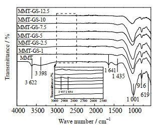 蒙脱石(MMT)和蒙脱石-葡萄糖(MMT-GS)的FT-IR图如图 2所示。3 622和916 cm−1处为蒙脱石中Al─OH的伸缩振动和弯曲振动峰[33];3 398和1 641 cm−1处为蒙脱石中吸附水和层间水的羟基的伸缩振动和弯曲振动峰;蒙脱石中存在碳酸盐,因此,在1 435 cm−1处出现了碳酸盐中C─O的伸缩振动峰(表 1);997和789 cm−1处为Si─O的伸缩振动峰[34];619 cm−1处为蒙脱石中Si─O─Al的吸收峰。对比蒙脱石(MMT)和蒙脱石-葡萄糖(MMT-GS)的FT-IR图发现,蒙脱石-葡萄糖(MMT-GS)在3 622、3 398和1 641 cm−1处的振动峰有明显减弱,可能是蒙脱石易吸附空气中的水分,导致蒙脱石中吸附水和层间水的─OH含量较高。对于蒙脱石-葡萄糖(MMT-GS),在2 937和2 852 cm−1处出现了C─H和─CH2─的伸缩振动峰[32],蒙脱石中不存在C─H和─CH2─等官能团,而葡萄糖分子中存在C─H和─CH2─。随着葡萄糖质量分数的增加,C─H和─CH2─的伸缩振动峰吸收峰逐渐增强,说明蒙脱石吸附的葡萄糖含量逐渐增多。这与表 1中蒙脱石-葡萄糖(MMT-GS)中的葡萄糖质量分数随溶液中葡萄糖质量分数的增加而增加相对应。蒙脱石-葡萄糖(MMT-GS)中C─H和─CH2─有机官能团的出现,证明蒙脱石已经成功吸附葡萄糖。