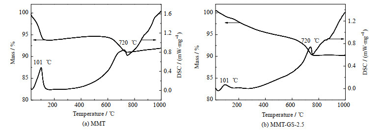 图 3 MMT和MMT-GS-2.5的TG-DSC图 Fig.3 TG-DSC curves of MMT and MMT-GS-2.5 |