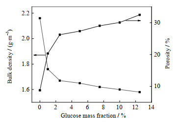 虽然前人开展了较多的黏土基陶瓷研究,但兼具力学和功能特性的黏土基陶瓷研究相对较少。碳引入陶瓷基体可以改善陶瓷导电性,但碳大多以共混方式引入。陶瓷制备方法以烧结为主,力学性能有待提高。本研究报道了一种利用蒙脱石的模板吸附特性,在蒙脱石表面或层间吸附葡萄糖小分子,然后通过热压烧结原位制备蒙脱石基陶瓷/碳复合材料,研究葡萄糖含量对蒙脱石基陶瓷/碳复合材料力学性能和导电性能的影响。相比于常规的粉末烧结法制备陶瓷材料,热压烧结(HP)在单轴加压的同时进行加热。在热压烧结过程中,处于热塑性状态的粉末有利于流动传质和接触扩散,可以降低烧结压力和温度,缩短烧结时间,得到晶粒小、致密度高的陶瓷[9]。由于碳材料普遍具有导电特性,蒙脱石吸附的葡萄糖分子在高温热压过程中原位转变为碳,可以赋予蒙脱石基陶瓷导电功能特性。更重要的是,蒙脱石吸附的葡萄糖在碳化过程中脱除非碳原子,在陶瓷中留下孔隙,形成多孔陶瓷。多孔陶瓷具有广泛的应用,如分离材料[28]、催化剂载体[29]、电极载体[30]、吸波材料[31]等。本研究报道的这种保持一定力学性能的多孔导电陶瓷具有电磁波吸收功能,有望在电磁波防护领域如作为天线罩使用。