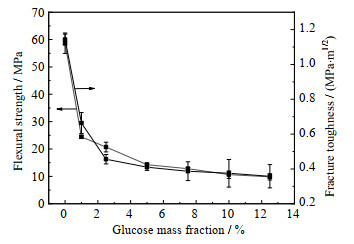 蒙脱石基陶瓷(HPMMT)和蒙脱石基陶瓷/碳(HPMMT-GS)复合材料的弯曲强度和断裂韧性如图 7所示。随着葡萄糖质量分数的增加,蒙脱石基陶瓷/碳(HPMMT-GS)复合材料弯曲强度和断裂韧性先急剧降低而后缓慢下降。研究表明,弯曲强度σ和气孔率P的函数可表示为[39]