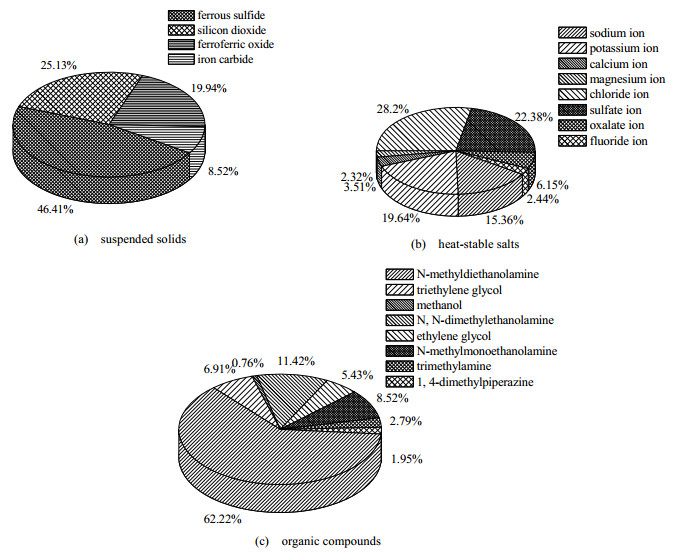 由图 2可知,在该失活脱硫溶液中,固体悬浮物主要含有FeS、SiO2、Fe3O4和Fe3C,尤以含硫化合物居多,故硫化氢和游离水共存下的Fe-H2S-H2O体系电化学腐蚀产物是固体悬浮物的主要来源。热稳定性盐以Na+、K+、Ca2+、Mg2+以及Cl-、SO42-、C2O42-、F-为主,它们大多来自原料气中携带的高矿化度地层水。有机物则包括N-甲基二乙醇胺、三甘醇、甲醇、N, N-二甲基乙醇胺、乙二醇、N-甲基乙醇胺、三甲胺与1, 4-二甲基哌嗪,其中,N-甲基二乙醇胺为失活脱硫溶液的主要组成,占有机物总质量的62.22%;三甘醇、甲醇分别是上游天然气开采、集输过程中常用的热力学抑制剂和脱水吸收剂;而N, N-二甲基乙醇胺、乙二醇、N-甲基乙醇胺、三甲胺、1, 4-二甲基哌嗪均属于N-甲基二乙醇胺的降解产物[21]。虽然上述有机物组成分析结果表明在失活脱硫溶液中仍然存在大量的N-甲基二乙醇胺有效成分,但是鉴于脱硫溶液的作用机理实质上为N-甲基二乙醇胺与硫化氢、二氧化碳解离产生的质子发生液膜控制的多步可逆反应,因此当该脱硫溶液被固体悬浮物、热稳定性盐和有机物所污染时,若污染物与N-甲基二乙醇胺形成热稳定物质并在解吸条件下无法分解再生,则此酸碱反应过程将受到抑制和阻断,被质子化的脱硫溶液亦会逐渐丧失活性,不能与酸性组分正常反应,从而直接导致其脱硫性能较新鲜溶液显著降低甚至失活。