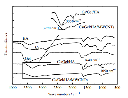 2 实验材料和方法 2.1 实验材料壳聚糖(Cs, 脱乙酰度≥85%, 上海生物科技有限公司);明胶(Gel, 国药集团化学试剂有限公司);透明质酸(HA,大连英斯特生物技术有限公司);多壁碳纳米管(MWCNTs, 北京博宇高科新材料公司);N-羟基琥珀酰亚胺(NHS, 上海共价化学科技有限公司);碳化二亚胺(EDC, 上海共价化学科技有限公司);MTT检测试剂盒(南京凯基生物科技发展有限公司);胎牛血清(FBS, 金元康生物科技有限公司);DMEM培养基(Life Technologies Corporation);冷冻干燥机(上海豫明仪器有限公司);傅立叶变换红外光谱仪(FTIR, Perkin Elmer., USA);倒置相差显微镜(OLYMPUS Ⅸ70);扫描电子显微镜(SEM, S2520, Hitachi, Japan)。