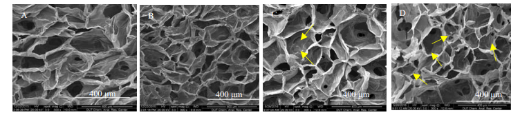 图 2 复合支架的扫描电镜图 Fig.2 Scanning electron micrographs of: (A) Cs/Gel/HA scaffolds, (B) Cs/Gel/HA scaffolds with 2% MWCNTs, (C) Cs/Gel/HA scaffolds with 6% MWCNTs, (D) Cs/Gel/HA scaffolds with 10% MWCNTs |