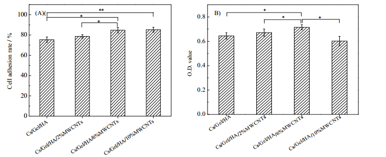 图 3 细胞在不同支架上的粘附率(A)及活力(B) Fig.3 Cell adhesion (A) and viability (B) on scaffolds with different MWCNTs contents Data were averaged from three repeats and (*) p < 0.05, (**) p < 0.01 |