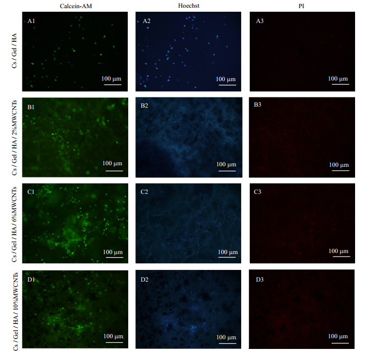 细胞在支架上生长的死活染色结果如图 4所示,细胞能够分布在支架当中,且MWCNTs含量为6%的支架上细胞更多,与细胞活力检测结果一致。以上结果表明本研究制备的支架具有良好的生物相容性。
