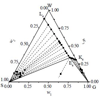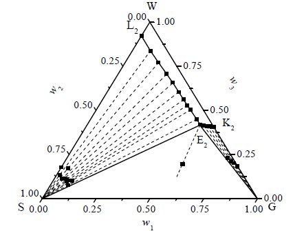 图 1为三元体系298 K相图,E2为该温度二元体系纳米腐植酸和尿素共饱和点,其组分为:纳米腐植酸 7.83%,CO(NH2)2 H2O 92.17%,相图中平衡固相纳米腐植酸尿素结晶区面积所占百分数为41.65%;图 2为三元体系303 K相图,E3为此温度下纳米腐植酸及CO(NH2)2共饱和点,其组分为:纳米腐植酸 9.14%,CO(NH2)2H2O 90.86%;相图中平衡固相结晶区纳米腐植酸-CO(NH2)2面积所占百分数为36.35%;图 3为三元体系308K相图,E4为该温度下纳米腐植酸和CO(NH2)2共饱和点,其组分分别为:纳米腐植酸11.70%、CO(NH2)2 H2O 88.30%,该温度下相图平衡固相结晶区纳米腐植酸-CO(NH2)2面积所占百分数为31.05%。同时,由图 1、图 2和图 3于298 K、303 K与308 K 时纳米腐植酸-尿素-水三元体系固液相平衡图可知:相图中固相结晶区域存在三个,WL2E2K2、WL3E3K3、WL4E4K4为未饱和液相区;L2SE2、L3SE3、L4SE4为纯的纳米腐植酸结晶区;E2SG、E3SG及E4SG为纳米腐植酸与尿素共结晶区;K2E2G、K3E3G及K4E4G为纯的尿素结晶区。通过298、303及308 K条件下相图对比可得,当温度从298 K到308 K时,纳米腐植酸与尿素的溶解度增加,共饱和点(E)下移,相应的固相结晶区变小,所形成的未饱和液相区变大,表明温度对其溶解度、固相结晶区和未饱和液相区有显著影响。