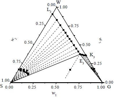 图 3 308 K时纳米腐植酸-尿素-水三元体系相图 Fig.3 Phase diagram of the nanoscale humic acid-urea-water system at 308 K w1: mass fraction of water; w2: mass fraction of nanoscale humic acid; w3: mass fraction of urea S: nanoscale humic acid; G: urea; W: water |