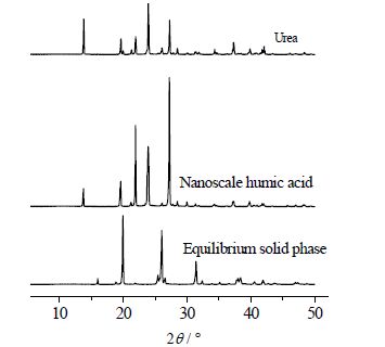 固溶体是指少数具有一个共同离子的两种盐以固体形式生成以原子、离子或分子分散的均匀混合结晶体,即生成一个或几个组成可变的固相[13, 14]。为确认体系中是否有固溶体形成,实验达到相平衡时,取一定量湿固相样,先抽滤,一部分置于80℃干燥箱中2 h,取出后研磨成粉状,进行X-射线衍射分析,结果如图 5所示。通过比较图 4 中纳米腐植酸、CO(NH2)2及固相平衡时衍射图谱可发现,平衡固相2θ = 20.6、25.3、26.9、32.1及38.3°处特征衍射峰与纳米腐植酸、CO(NH2)2特征峰基本吻合,组分无显著性变化,表明各组分物相稳定,结晶完整;峰形尖锐和峰强度增大,只是说明固相结晶区所形成晶粒逐渐长大,但该三元体系并无固溶体形成,且无形成一个或几个组分可变的平衡固相。