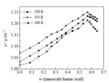 由表 2、表 3、表 4中相关平衡液相密度数据,绘制了298、303及308 K条件下以平衡液相中纳米腐植酸质量分数为横坐标的密度-组成图,结果如图 5所示。