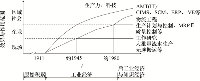 图 3 工业工程核心知识体系与工业化进程的关系 Fig. 3 The relationship between the industrialization tracing and core knowledge systems in industrial engineering |