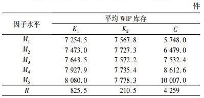 对表 3的仿真数据进行直观分析,计算K1、K2和看板容量在5个水平下订单满足率及平均在制品指标的均值,从而得到各个因素在所有水平下实验结果的极差(如表 4、5所示)。