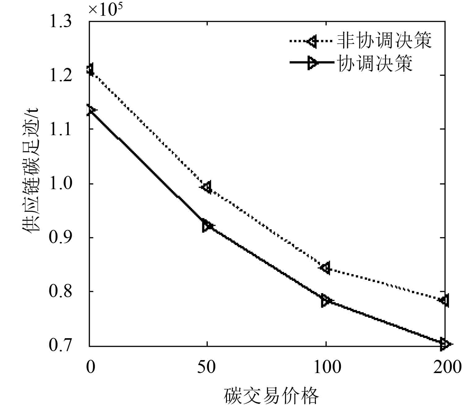 图5表明碳分配额度增减不会影响供应链碳足迹,这与前面的结论相同。然而,在图6中,碳交易价格高低对碳足迹影响显著,供应链获得的全部配额为78 000 t,当交易价格P=200时,协调决策碳足迹为70 400 t,高交易价格下反而出现碳配额结余。