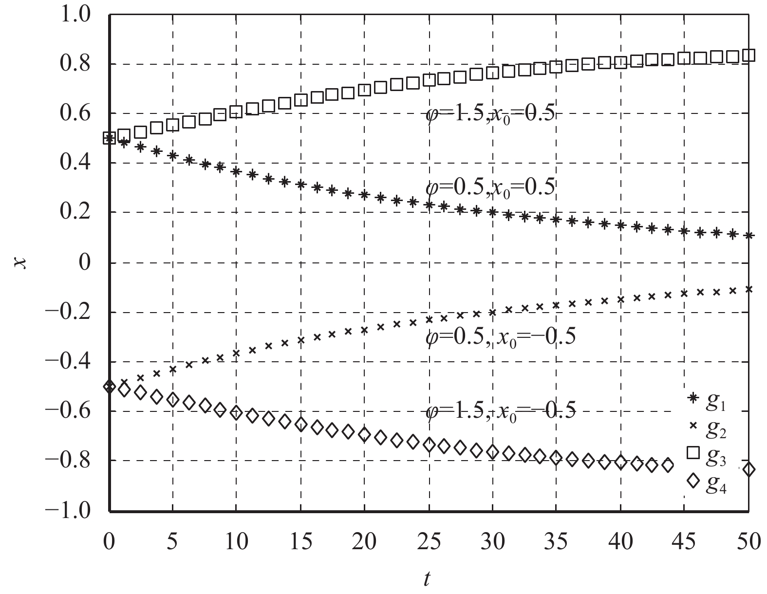 首先,探究易感系数φ=by对x变化率的影响。分别令φ1=0.5,φ2=1.5,则具体如图2所示。