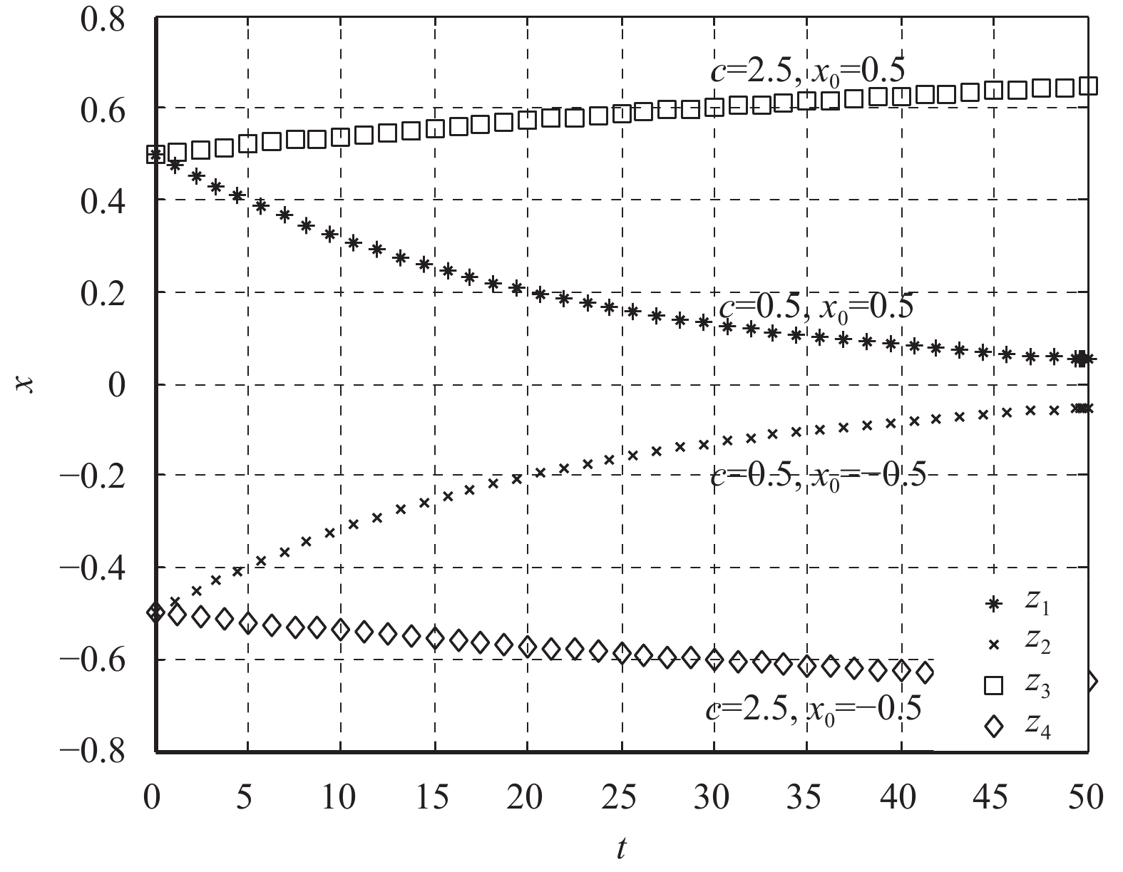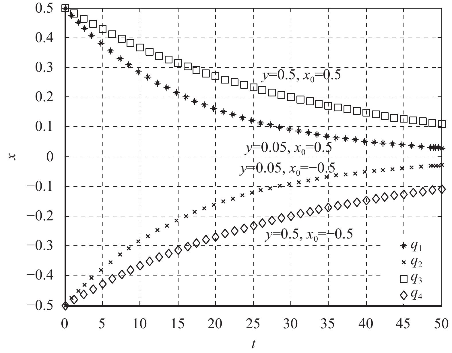3.2 不同持有鲜明态度的群体比例仿真取不同持有鲜明态度的群体比例进行仿真分析,即探究不同y的取值下系统的变化。假设c=1,m=1,分别取(y, x)=(0.05, 0.5),(0.05, –0.5),(0.5, 0.5),(0.5, –0.5)进行模拟,结果如图5所示。