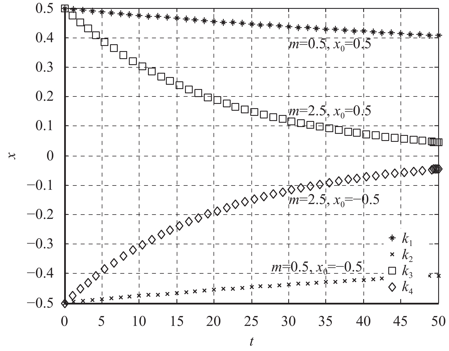 令c=1,y=0.5,分别取(m, x)=(0.5, 0.5),(0.5, –0.5),(2.5, 0.5),(2.5, –0.5)进行模拟,结果如图4所示,分别用函数k1,k2,k3,k4表示。