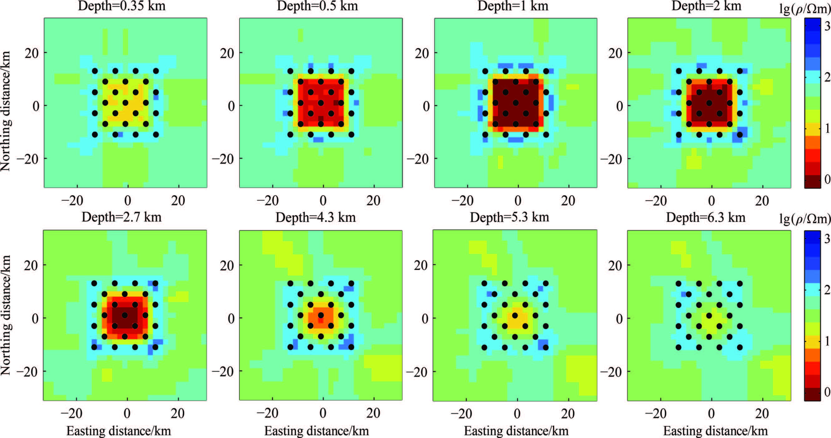 Fig.8 Horizontal slice of inversion results for model II at different depths "•" denotes MT site. |