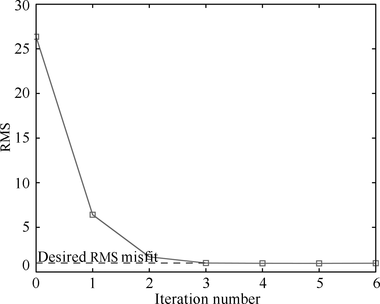 The target misfit 0.98 is obtained after 6 iterations. Fig.4 demonstrates the inversion results of slices at different depths,and Fig.5 shows the inversion results of different sections. From Figs. 4 and 5,it can be noticed that the resolved resistivity images finely reflect the true shape and position of the anomalous body. Fig.6 displays the relationship between the number of iterations and data misfit RMS. From the first to the third iteration,the RMS decreases greatly and reaches the desired level of misfit at third iteration,which refers to the first stage of data-space approach; from the 4th to 6th iteration,the algorithm searches for the minimum structure model while keeping the data misfit at the desired level,which refers to the second stage of data-space approach.