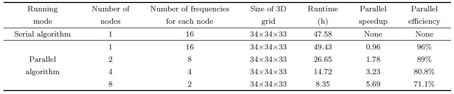 6 CONCLUSIONSWe implemented a 3D MT data-space parallel inversion algorithm using MPI on the Downing highperformance computing platform Dawn TC5000A. The parallel algorithm employs a coarse-grained parallelization scheme based on frequency division and matrix decomposition. This parallelization contains 3D forward modeling,sensitivity forming and matrix-vector multiplication as well as model update,which not just speeds up the calculation,but also reduces required memory. The numerical experiments for synthetic data from two models show that this 3D MT data-space parallel inverse algorithm is feasible and efficient. By assigning optimal computing nodes,we can obtain better parallel speedup and parallel efficiency. The parallel scheme provides a promising approach to the challenge of substantial computation and memory requirement in 3D MT inverse problems,which would advance the application of 3D MT inversion of field data.