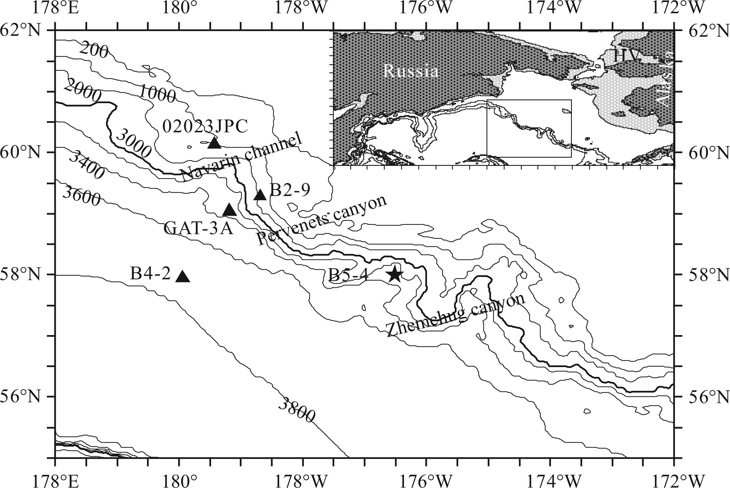 2 MATERIAL AND METHODThe core sample B5-4 was retrieved in the First Arctic Expedition of China in 1999 at the foot of Northeastern slope in Bering Sea (58°05'16''N, 176°31'19''W), which is within a branch of Zhemchug submarine canyon with water depth of 3370 m and total length of 4.70 m. The topography of the whole slope is characterized by flat sections shallower than 1000 m and deeper than 3000 m, and steep section between 1000~3000 m where several huge canyons are present (Fig.1). The surface water above this core site is covered by Bering Sea Slope Current and therefore an area of high productivity called the green belt[10].