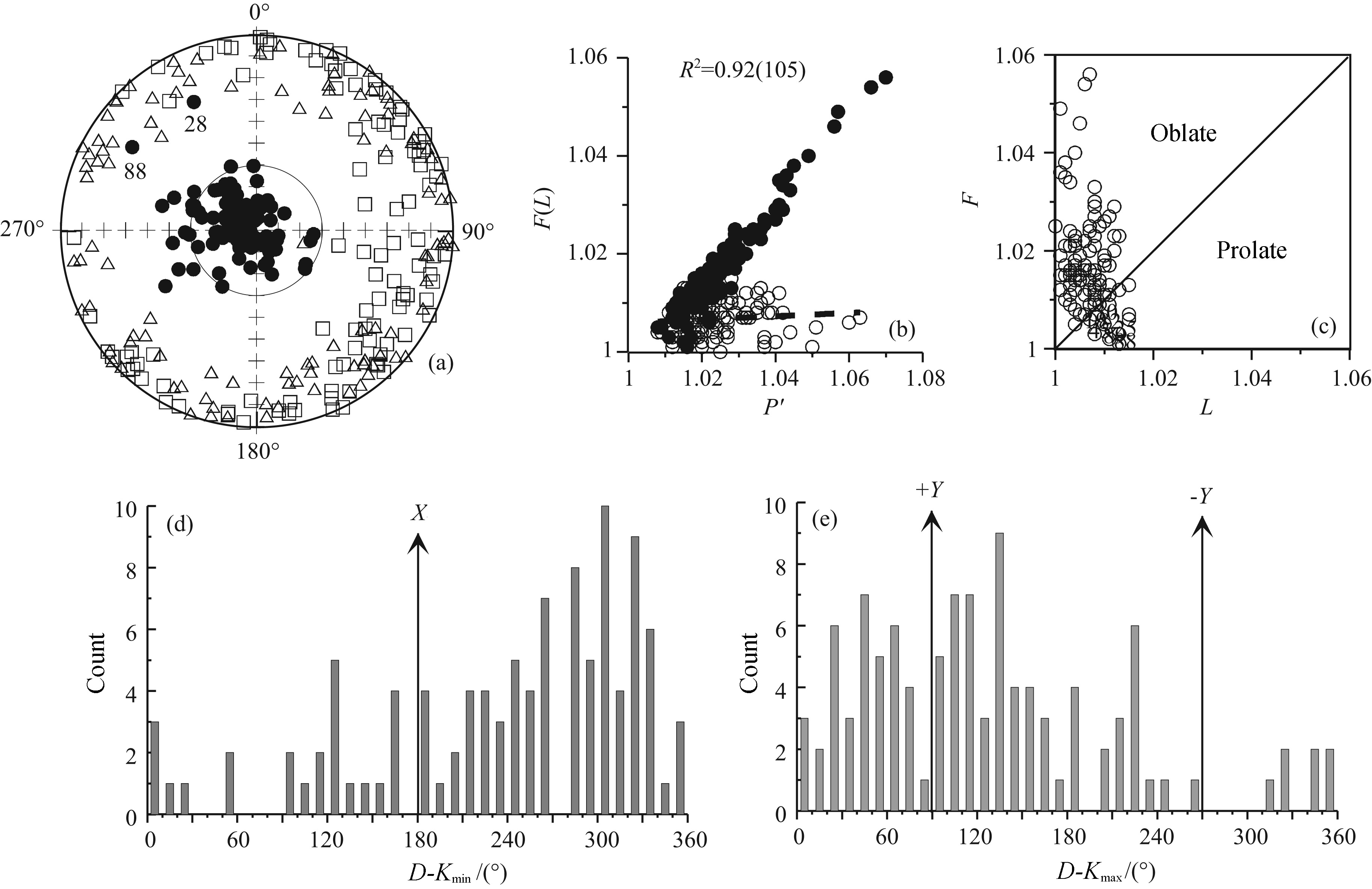 3 RESULTS 3.1 AMSAMS of oriented samples show that most inclinations of the short axis (90/105) are steeper than 60° and those of long (98/105) and medium axis (104/105) shallower than 30° and no dominant directions for the latter two (Fig.2a). Corrected anisotropy degree (P') is linearly related with foliation (F) (R2 = 0.92, n = 105), but not with lineation (L) (R2 = 0.01, n = 105) (Fig.2b). The distribution plot of lineation and foliation indicates magnetic ellipsoid is mainly oblate (Fig.2c), i.e. the typical original sedimentary fabric. Both the orientation of three principal axes and the relationship between anisotropy parameters imply that magnetic grains are naturally aligned within water column and compacted by gravity. Except stronger water current revealed by 14% short axes departing from vertical position over 30°, relatively quiet water and no obvious disturbance of erosion or turbidity are hinted by most other samples. Under the coordinate of core splitting (facing upper surface of the core, downward push of box is -X, right is +Y , left is -Y , and downward along the core is Z+), declination of long and short axes do not orient along Y and X axis (Figs. 2d and 2e), therefore AMS observed here is not artificially induced by splitting process[12].