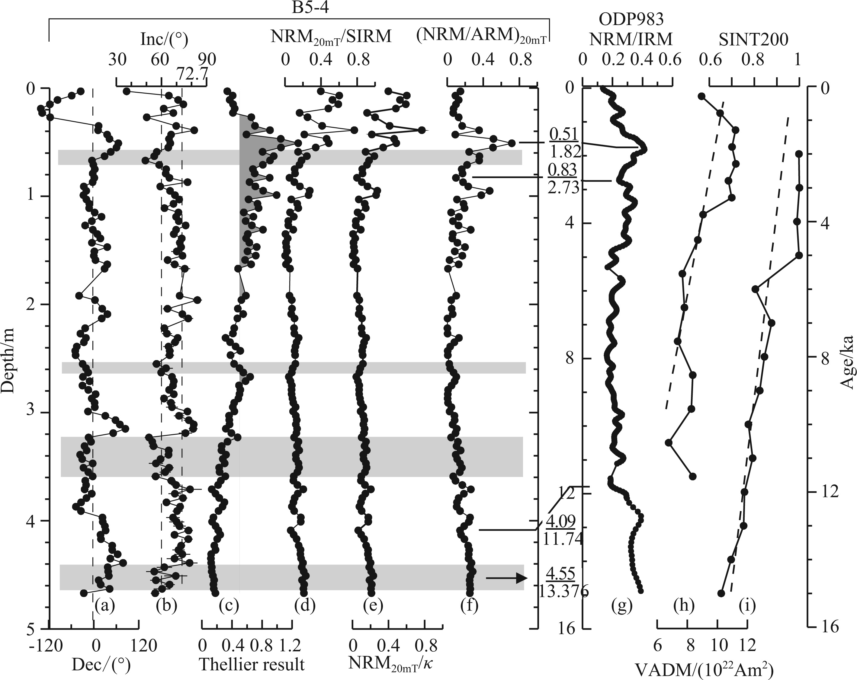 According to the dating and comparison of paleointensity, the single sample in B5-4 sediments represents ~120 a, so resolution is close to ODP983. The big peak at 1~3 ka on absolute record sprays into four (Figs. 8(b-d)) or five small peaks (Fig.8e), and the shape and peak-trough distribution correspond one to that of ODP 983. Low intensities at 3~8 ka have low amplitude and high frequency (Figs. 8(b-e)), which makes comparison with ODP 983 difficult and no more tie points produced. A declining trend is visible from 14 ka to 8 ka but no obvious tie points. Although there are three peaks at 12~10 ka B.P. in B5-4, the uncontinuity in ODP 983 inhibits further contrast. In spite of the scarcity of more tie points, the consistency between our result and the global stack, spherical harmonic model, especially with ODP983 is conspicuous, which proves that the relative paleointensity of this work is truly the refection of geomagnetic behavior rather than lithological characters, and the persistent magnetic flux at the core-mantle boundary proposed by Kort & Holem (2010)[23].