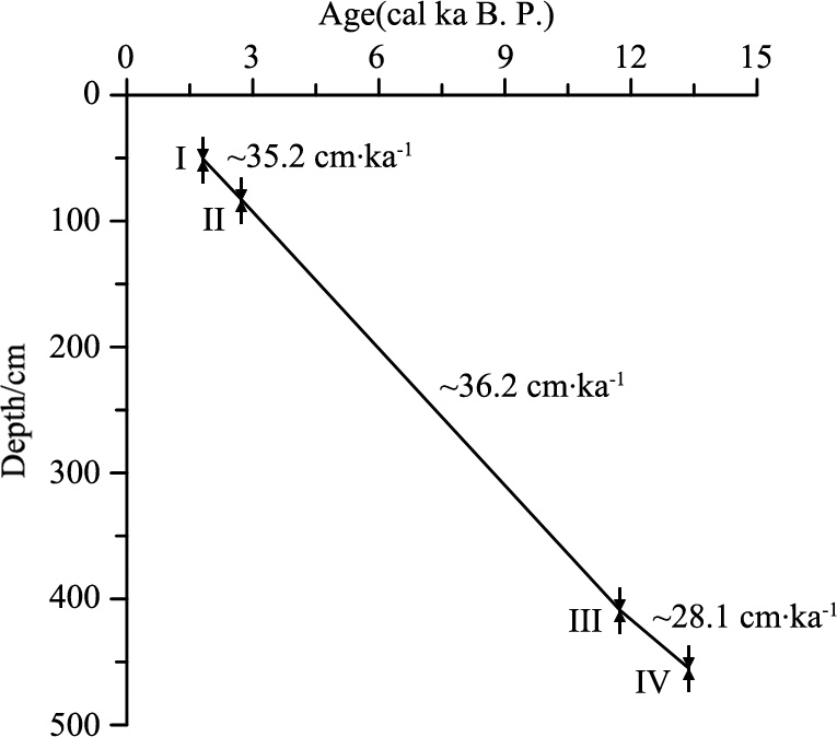 Based on the AMS 14C dating result, the relative paleointensity from B5-4 is compared with North Atlantic core ODP 983[17], absolute intensity of Holocene synthetic database[18] and global stack from marine sediment SINT 200[19] (Figs. 6(g-I)). The consistency between our result and ODP 983 is impressively high and an increasing trend in the latter two for the last 10 ka and 16 ka is also consistent with our result. The comparison with ODP 983 produces three tie points(Figs. 6(f, g)), and other ages are linearly interpolated and extrapolated. Nearly linear sedimentation rates indicate this comparison is reasonable and the average rate is 35 cm/ka for the whole core(Fig.7).