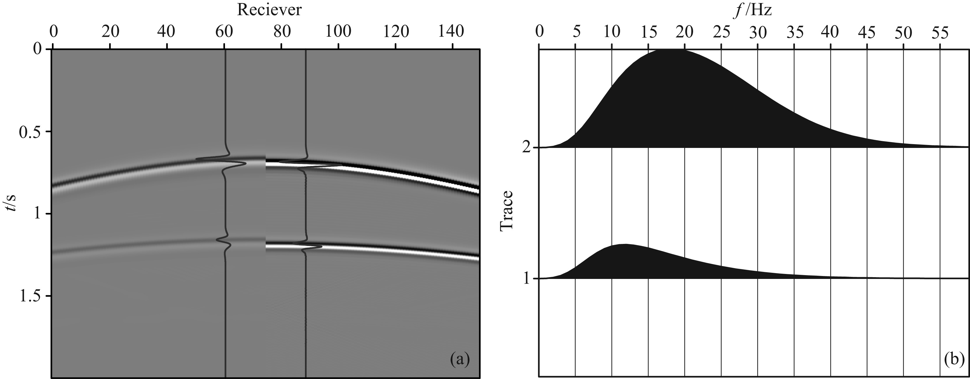 Fig.2 Comparison of shot gathers in visco-acoustic and acoustic medium (a) Comparison of shot gathers and waveform. Left is visco-acoustic data; right is acoustic data; (b) Comparison of amplitude spectrums. Trace 1 is visco-acoustic data, trace 2 is acoustic data. |