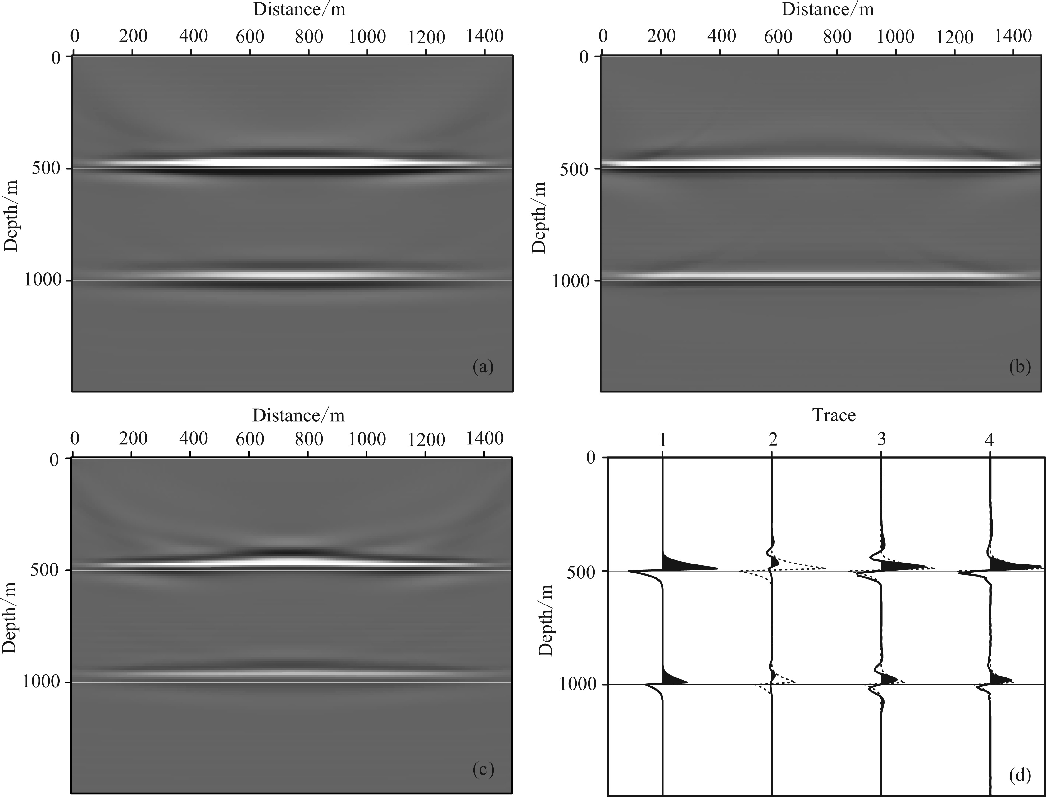The acoustic LSRTM imaging result is shown in Fig. 3c. This numerical test uses the same data but ignores the influence of the quality factor. Combined with Fig. 3d, we can find that the reflectors are mislocated because of velocity dispersion, and the imaging amplitude is too weak because of attenuation. In addition, some other imaging noises are imported in the acoustic LSRTM imaging result.