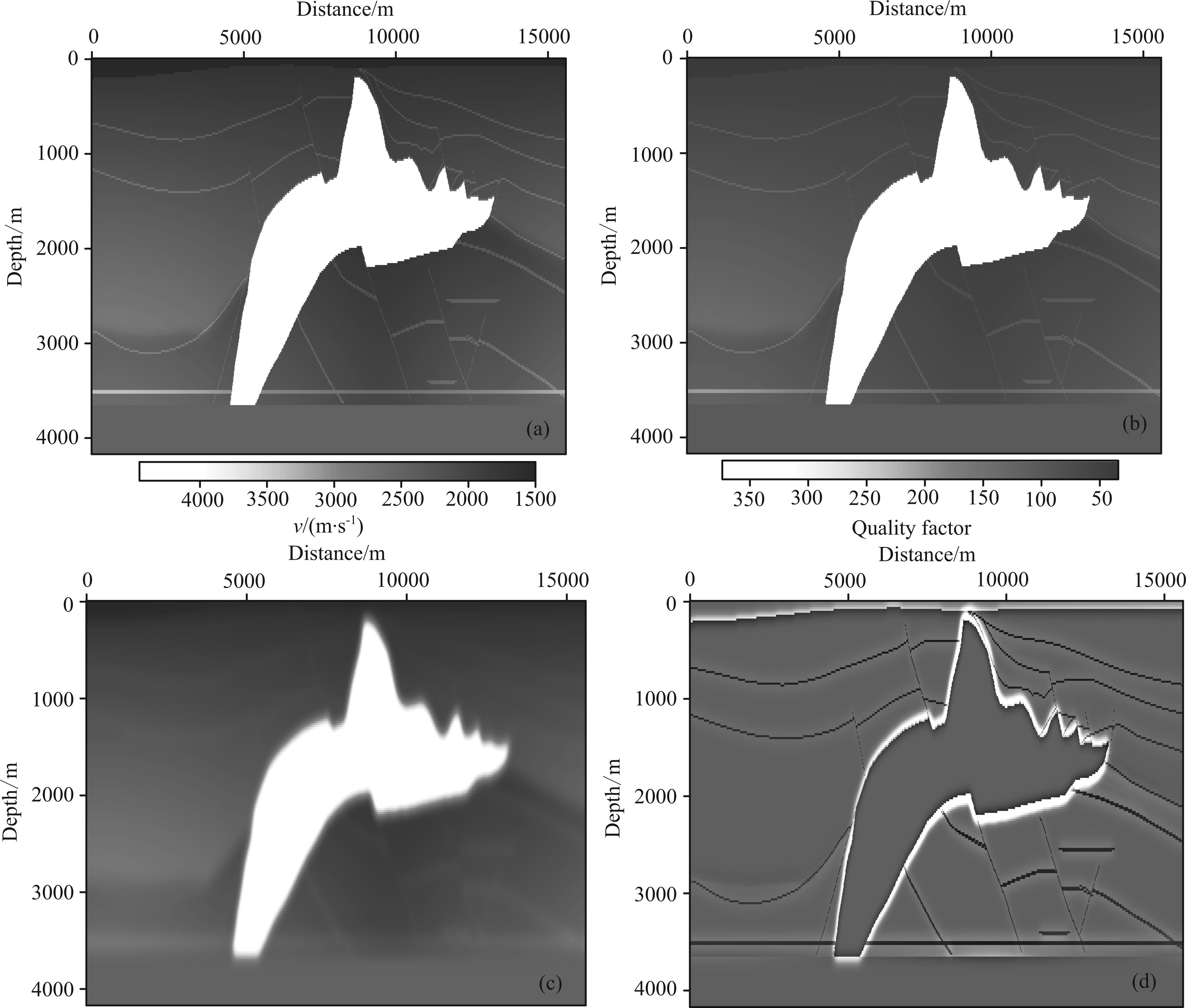 4.2 Salt ModelThe initial 2D salt model shown in Fig. 4a is a slice of the original 3D SEG/EAGE salt model. This model is used to verify the applicability of the imaging algorithm for the model with high-velocity anomalies. In this paper the quality factor model is constructed according to the Li’s empirical formula(Li, 1993).