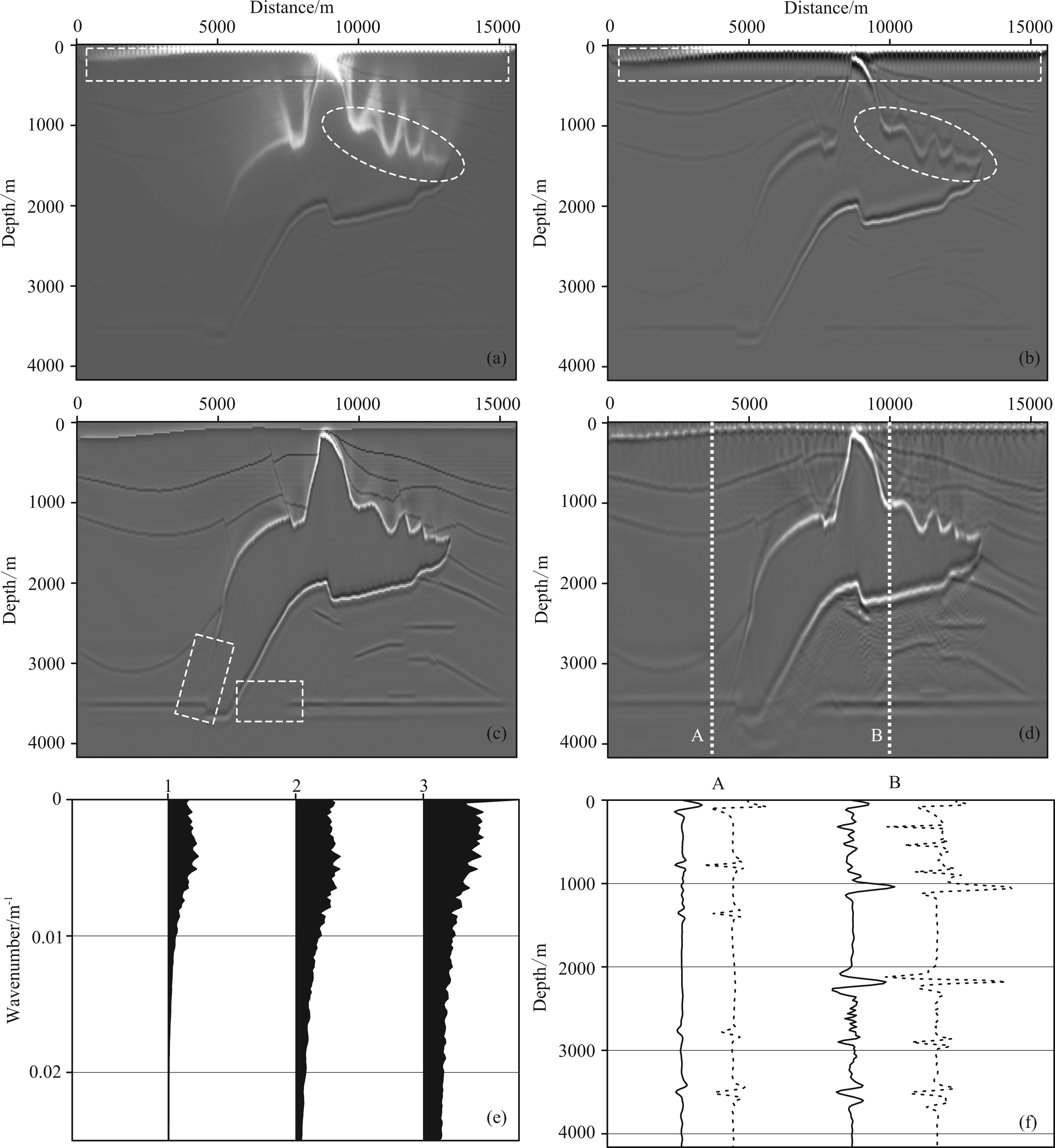 Fig.5 Comparison of image results of salt model (a) Image result at 1st iteration; (b) Applying high-pass filtering to Fig. 5a; (c) Image result at 50th iteration of visco-acoustic LSRTM; (d) Image result at 50th iteration of acoustic LSRTM; (e) Comparison of wavenumber spectrums, where the trace numbered with 1, 2, 3 is the wavenumber spectrum of the image result of acoustic LSRTM, visco-acoustic LSRTM, ideal image result respectively; (f) Comparison of image result in Fig 5c (dash line) and 5d (real line) at location A and B. |