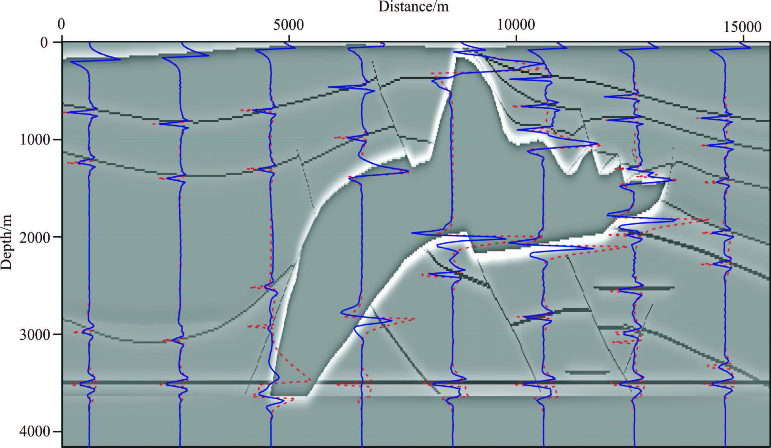 Fig.6 Comparison of image result and true slowness perturbation The background picture is the image of true slowness perturbation; the red dot line is exact value of slowness perturbation at this CDP; the blue line is the imaging result at this CDP. |