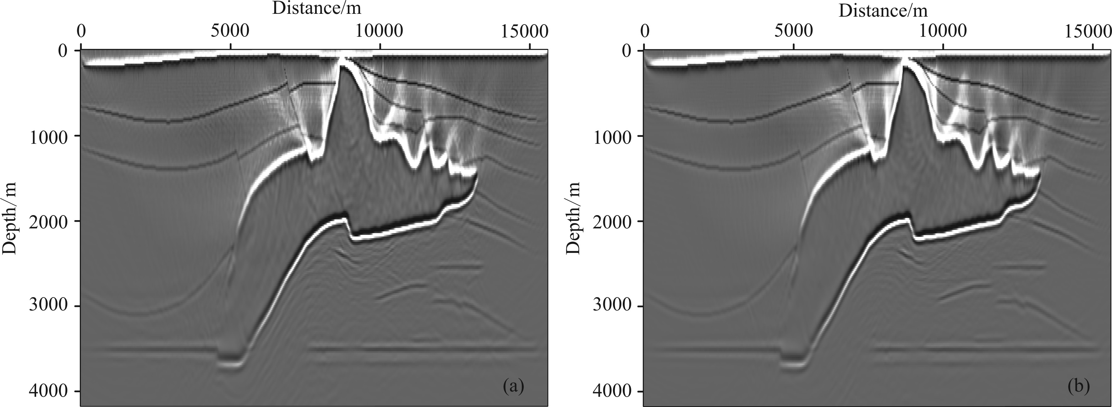 Fig.8 Image result at 10th iteration using multiple supergathers (a) The image result using 4 supergathers; (b) The image result using 8 supergathers. |
