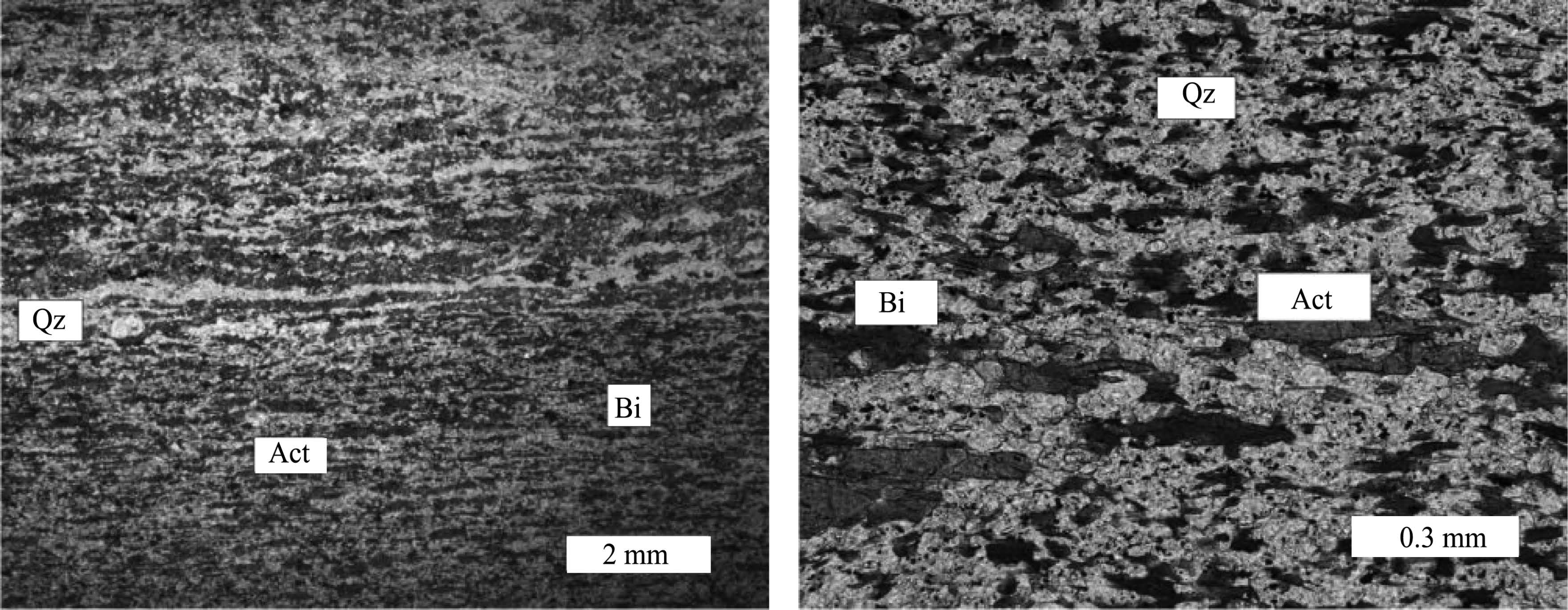 Fig.11 Microphotographs of sample B-1(Qz: quartz, Bi: biotite, Act: actinolite)(single polarization) |