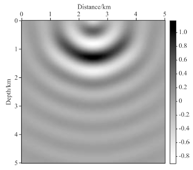 To prove the effectiveness of the Gaussian beam method on forward modeling, we simulate the wavefieldin a numerical model which is discretized by a 201×201 grid with grid interval being 25 m ×25 m. Thehomogeneous velocity is 3500 m·s-1. The synthetics are shown in Figs. 1 and 2.