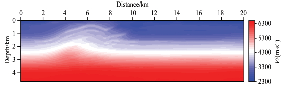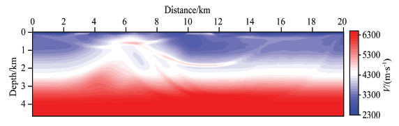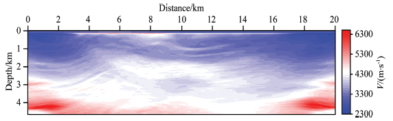 Due to that only the first-arrival waveform is used, FAWI has a weaker dependence on the starting modelcompared with conventional FWI(Sheng et al ., 2006). This is another advantage of the proposed GBFAWI. Totest this, we construct another starting model(as shown in Fig. 15)got by large-scale Gaussian smoothing ofthe real Overthrust model. Obviously, this starting model is almost 1D gradient. The reconstructed results of GBFAWI and traditional FWI are shown in Figs. 16 and 17, and the horizontal velocities at 500 m belowthe surface are shown in Fig. 18. We can see that the traditional acoustic FWI quickly converges to a localminimum which is far away from the real one. However, the result of GBFAWI still has good vertical and horizontal resolutions at the shallow parts, though the accuracy decreases compared with Fig. 11.