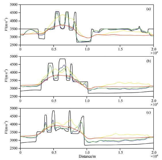 Fig. 13 Comparisons of vertical velocity sections of real model (black line), starting model (red line), reconstructed results of RFTT (yellow line), GBFAWI (green line) and acoustic FWI (blue line) at (a) 500 m, (b) 750 m, and (c) 1000 m blow the surface |