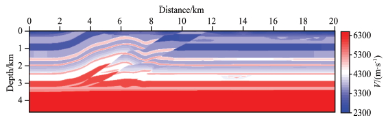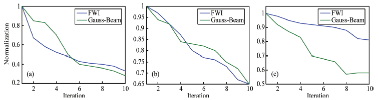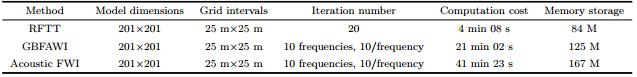 From Figs. 3–7 we can see that all of the three methods obtain good results because the model is simple and well covered by the acquisition. Meanwhile, it’s not difficult to find that the accuracy and resolution of theresult of GBFAWI is a little lower than traditional FWI, while much higher than RFTT. This is because that GBFAWI makes use of the first-arrival waveform instead of just the traveltime, and it uses the Gaussian beammethod to simulate the wavefield instead of the wave equation. The computation efficiencies and memory storagesof the three methods are shown in Table 1, from which we can find the big advantage of GBFAWI. Note that, similar with traditional frequency-domain FWI, the computation cost of frequency-domain FAWI is positivelyproportional to the inverted frequencies and the iteration number for each frequency. Thus, after normalizingthe iterations of RFTT and GBFAWI we can find that they have the similar efficiency in computation.