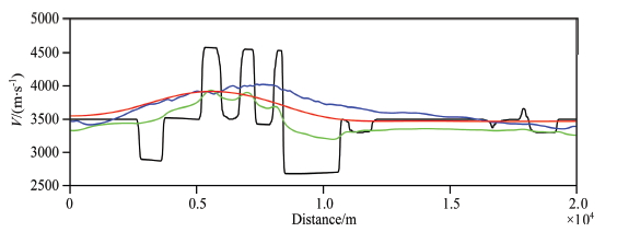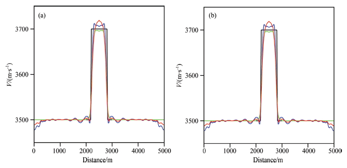 Fig. 7 Velocity sections at (a) z=2500 m and (b) x=2500 m of the real model and reconstructed results Black line: Real model; Green line: Reconstructed result of RFTT; Red line: Reconstructed result of GBFAWI; Blue line: Reconstructed result of traditional FWI. |