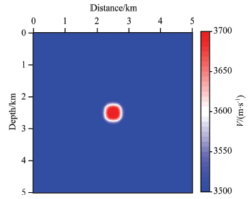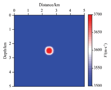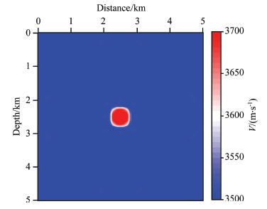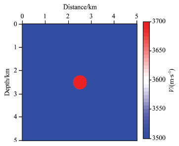 5 SYNTHETIC TESTSTo test the effectiveness of the proposed method, we compare it with RFTT and traditional frequencydomainacoustic FWI on the 2D Inclusion 1 model(Operto et al ., 2007). The real model is shown in Fig. 3, which consists of 201×201 nodes with node interval being 25 m×25 m. The background velocity is 3500 m·s-1, and the anomaly velocity is 3700 m·s-1. 84 sources and 84 receivers are uniformly spread on the four sides 500 minner from the edges. Both source interval and receiver interval are 200 m. The two waveform inversions use thefirst-order direction and the first-order step length. 10 frequencies are inverted with the starting frequency being2 Hz, and the frequency interval being 2 Hz as well. 10 iterations are implemented for each frequency. RFTTis not related with frequency, and the iteration number is set to be 20 for convenient comparison. The startingmodels for the three methods are the same being homogeneous background velocity. The final reconstructedresults are shown in Figs. 4–6. To compare the results quantitatively, a horizontal profile at z=2500 m and avertical profile at x=2500 m are extracted as shown in Fig. 7.