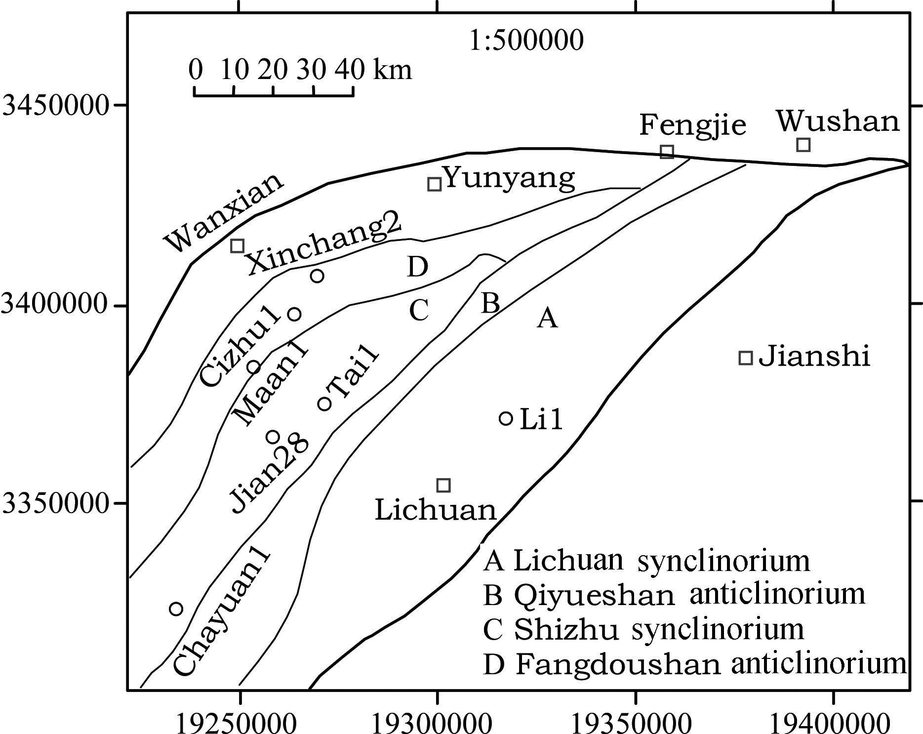 2 GEOLOGICAL SETTINGThe western Hubei and eastern Chongqing area is located to the south of the Yangtze River, the east of Wujiang River and the west of Jianshi-Pengshui fault; it includes 4 secondary tectonic units, i.e., the Fangdoushan anticlinorium, Shizhu synclinorium, Qiyueshan anticlinorium, and Lichuan synclinorium(Fig. 1). It covers an area of 20600 km2(Xiao et al., 2001).