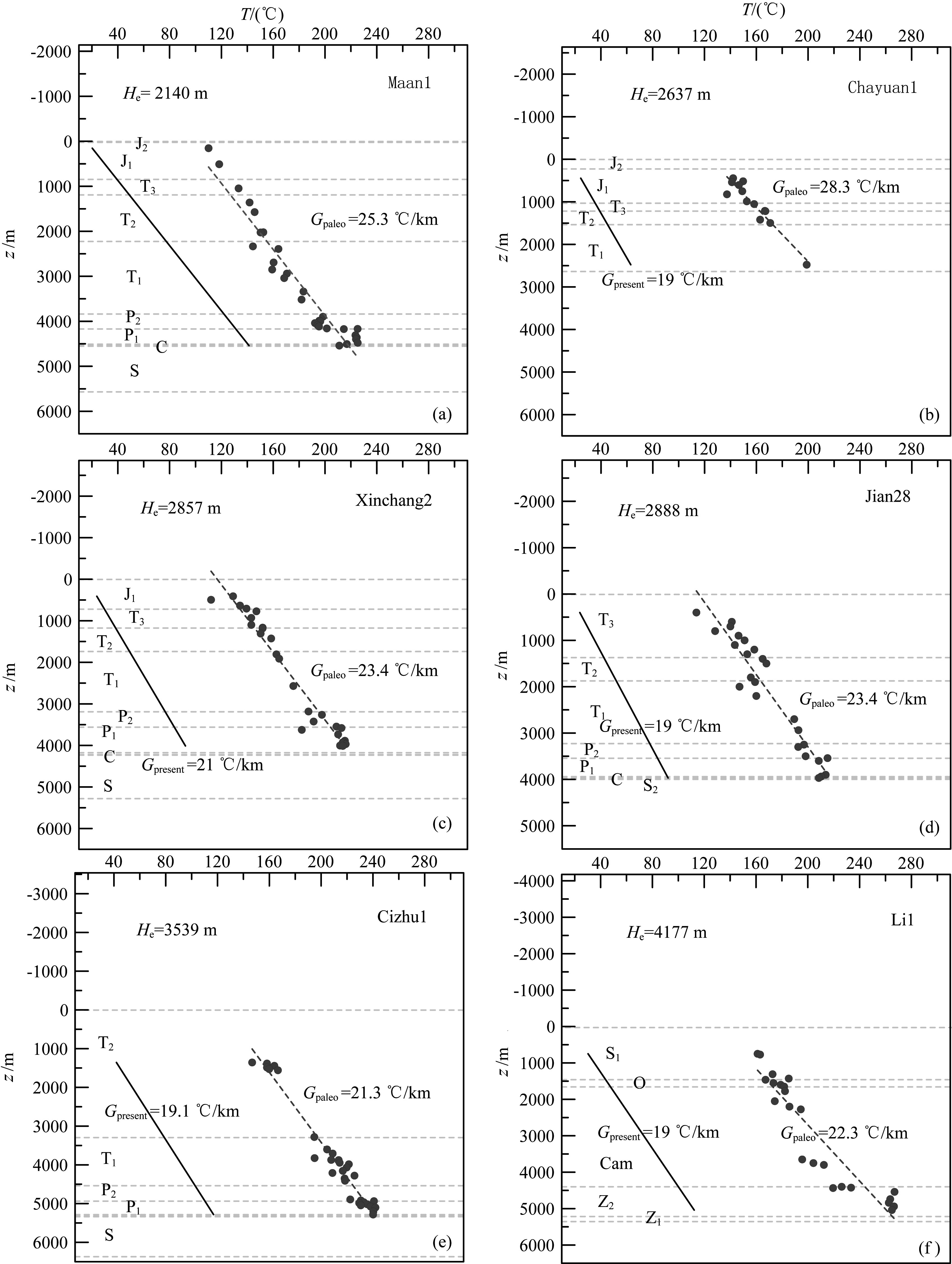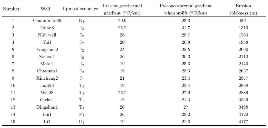The Maan1 well, Tai1 well, Chayuan1 well, Xinchang2 well, Cizhu1 well and Li1 well have been taken to recover the erosion thickness by the paleogeothermal gradient method. Those wells are distributed in different tectonic units and different upmost sequences in the western Hubei and eastern Chongqing area.